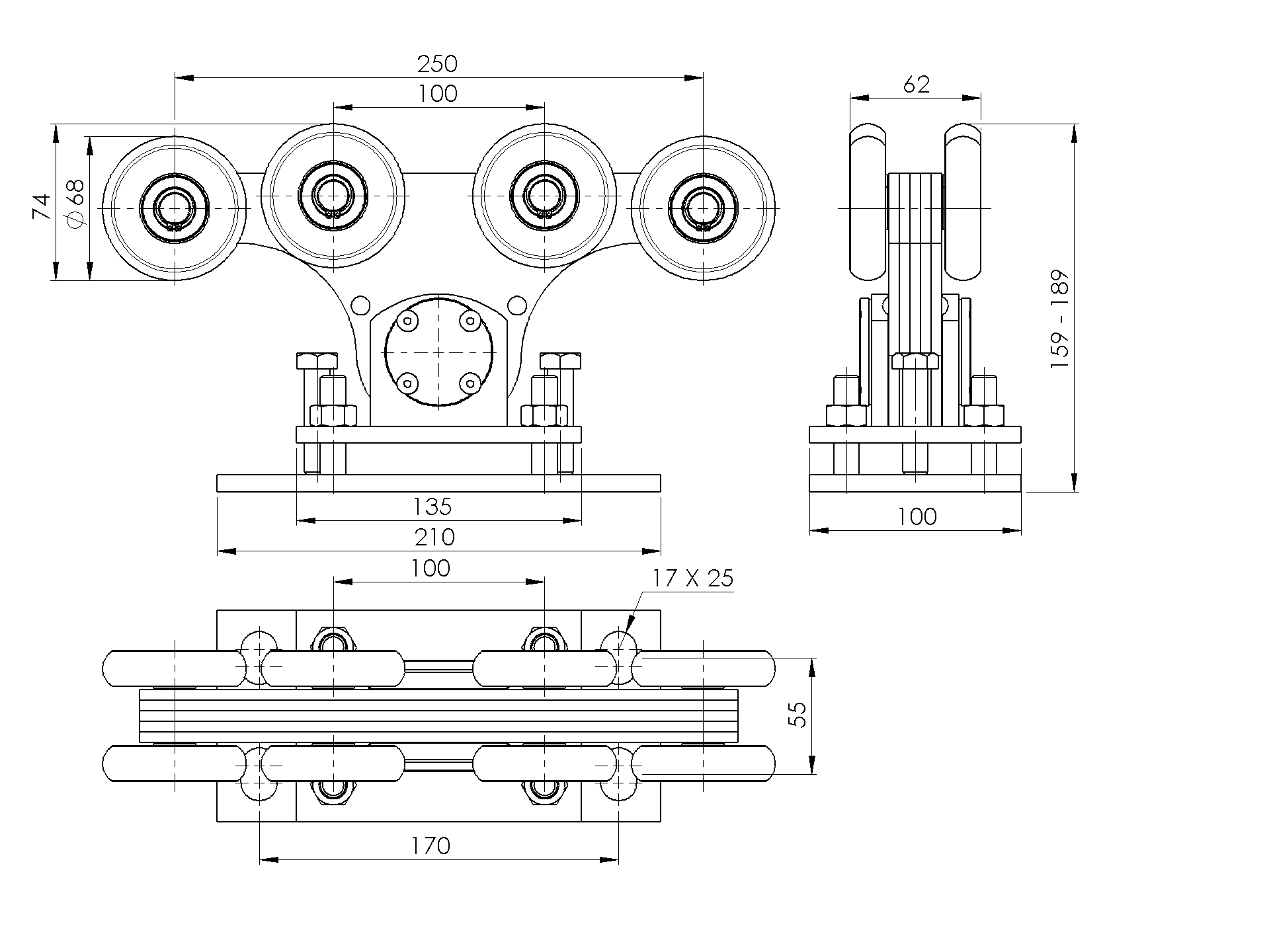 Chariot porteur Zn+NYLON, profil 80x80mm H/34-4-80x80-NYLON