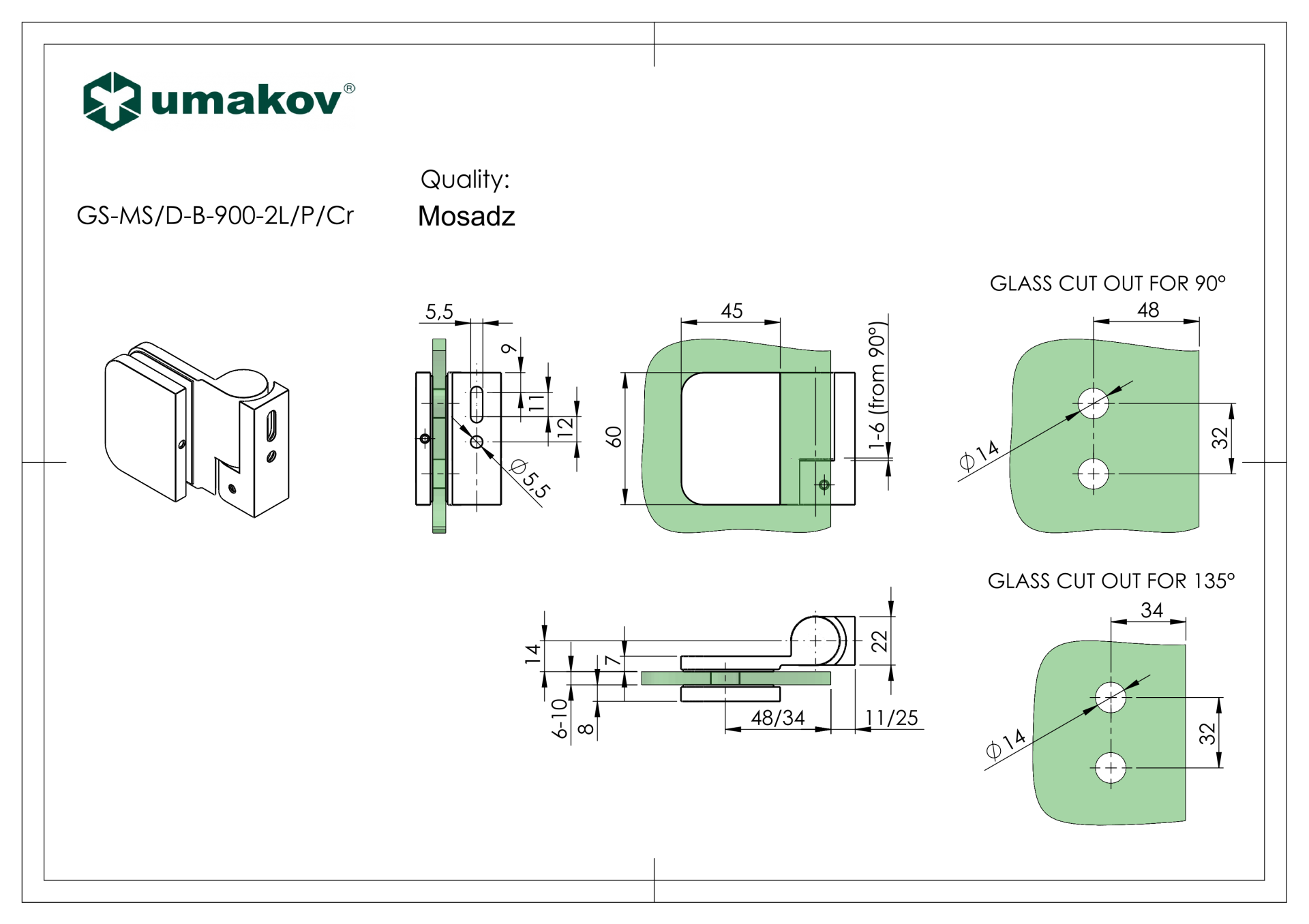 Glastürscharnier +/- 90° - Montage Glas GS-MS/D-B-9060-6/P/Cr