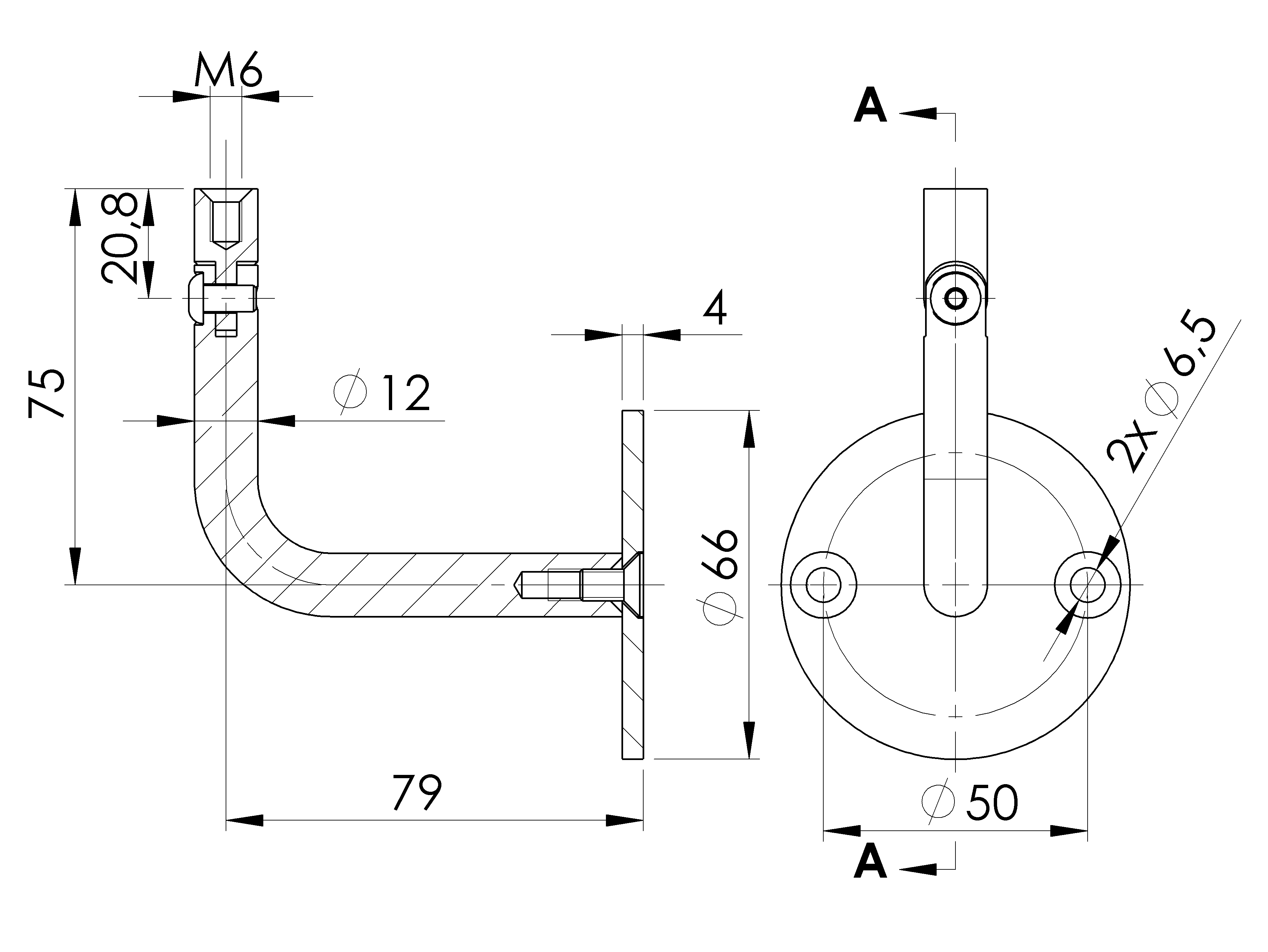 Niedrigster Preis in den letzten 30 Tagen: €2,08 ohne MwSt.Auf Lager (24999 Einheiten)Handlaufhalter an die Wand AISI304, d12, M6, 80x75 A/0130-M6