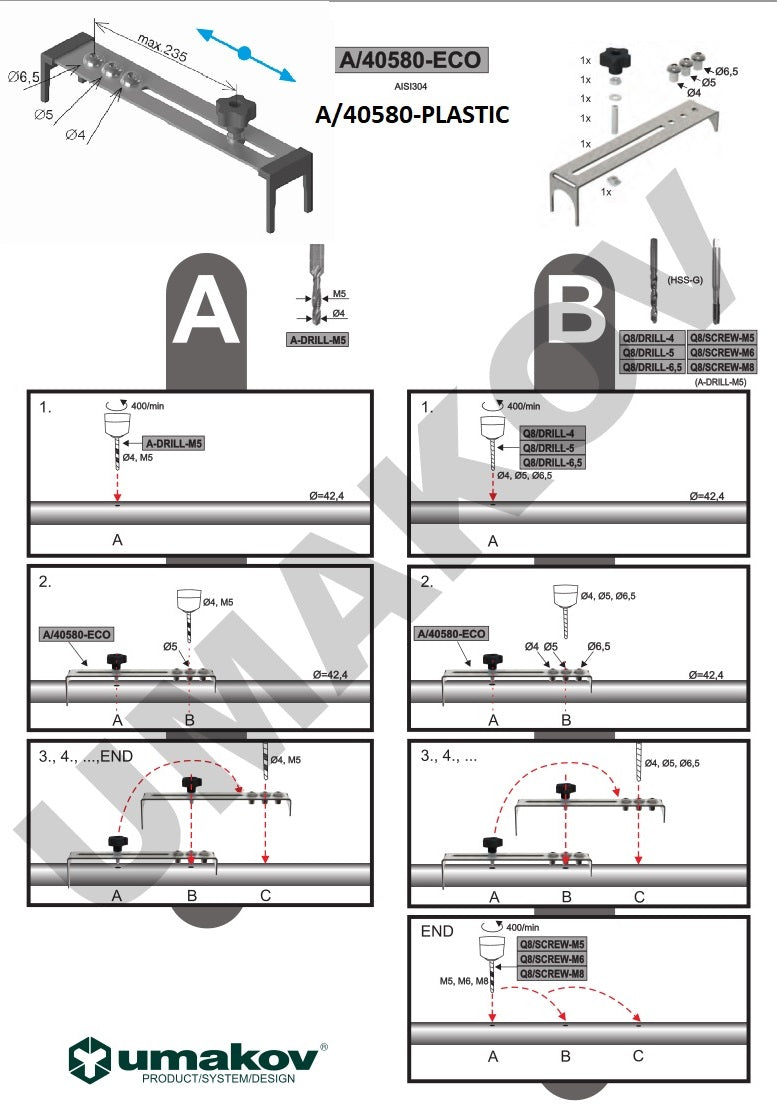Bohrforrichtung für Rohren D42,4x2mm, 40x40x2mm