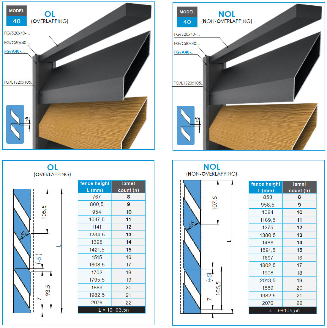 Kompletter Satz schräger Distanzabdeckleisten für das MOUNT L2 System. Mit diesem Set können Sie ein Zaunfeld mit einer maximalen Höhe von 1047,5 mm erstellen. Die Lamellen sind mit einer Überlappung von 5 mm montiert, wodurch das Zaunfeld undurchsichtig ist.