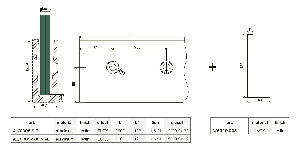 Aluprofil für Ganzglasgeländer - Seitenverankerung AL/0005-D-5000-S-E