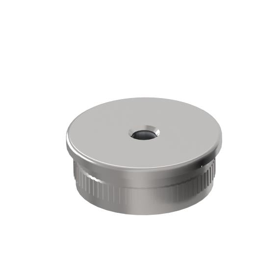 Edelstahl-Handlaufkappe flach mit Gewinde. Verbindung (Druck) durch Aufschlagen über Verzahnung.