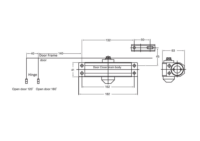 Self-closer for doors, adjustable 180 ° -15 ° and 15 ° -0 °, dimensions 182x41x63mm. Maximum door width 900 mm, with weight to 60 kg,