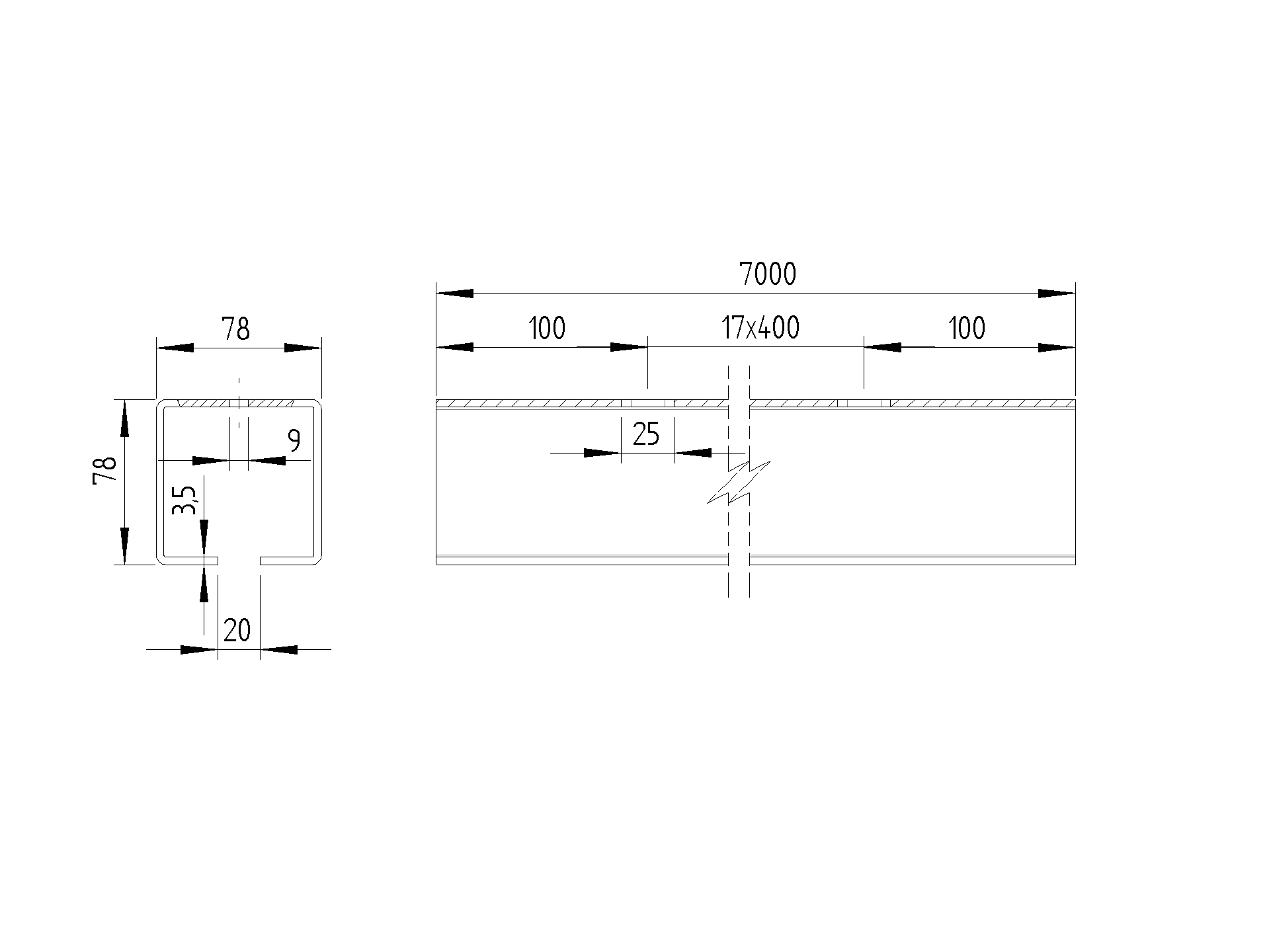 Guide profile with holes Zn, 78x78x4mm, L6m H/02-80x80-Zn-D-6000