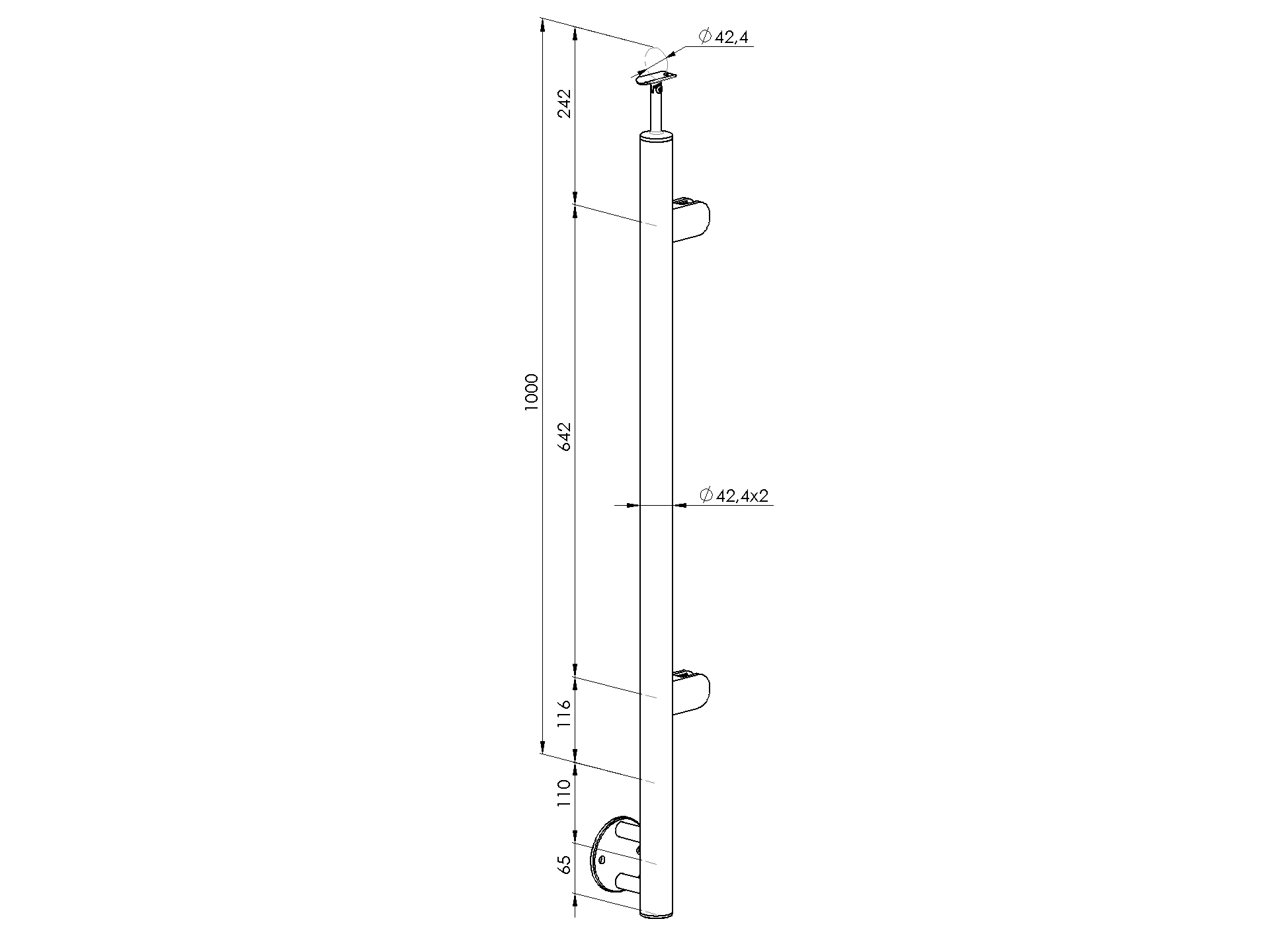 Stainless steel pole - BK, straight for hand rail D42,4mm, side anchoring, material AISI 304 satin K320, for glass, adjustable