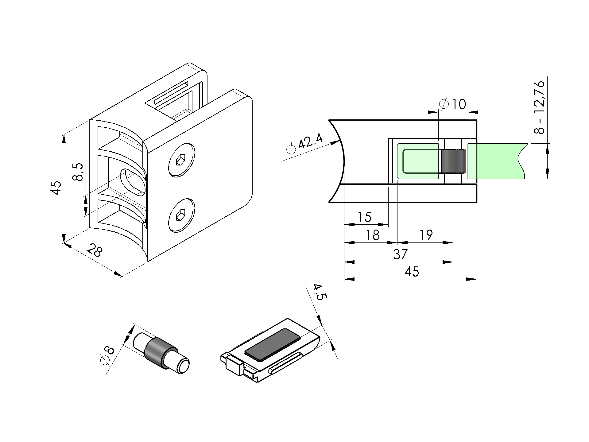 Glass clamp model 210P, D42,4x2/45x45mm A/210P-042