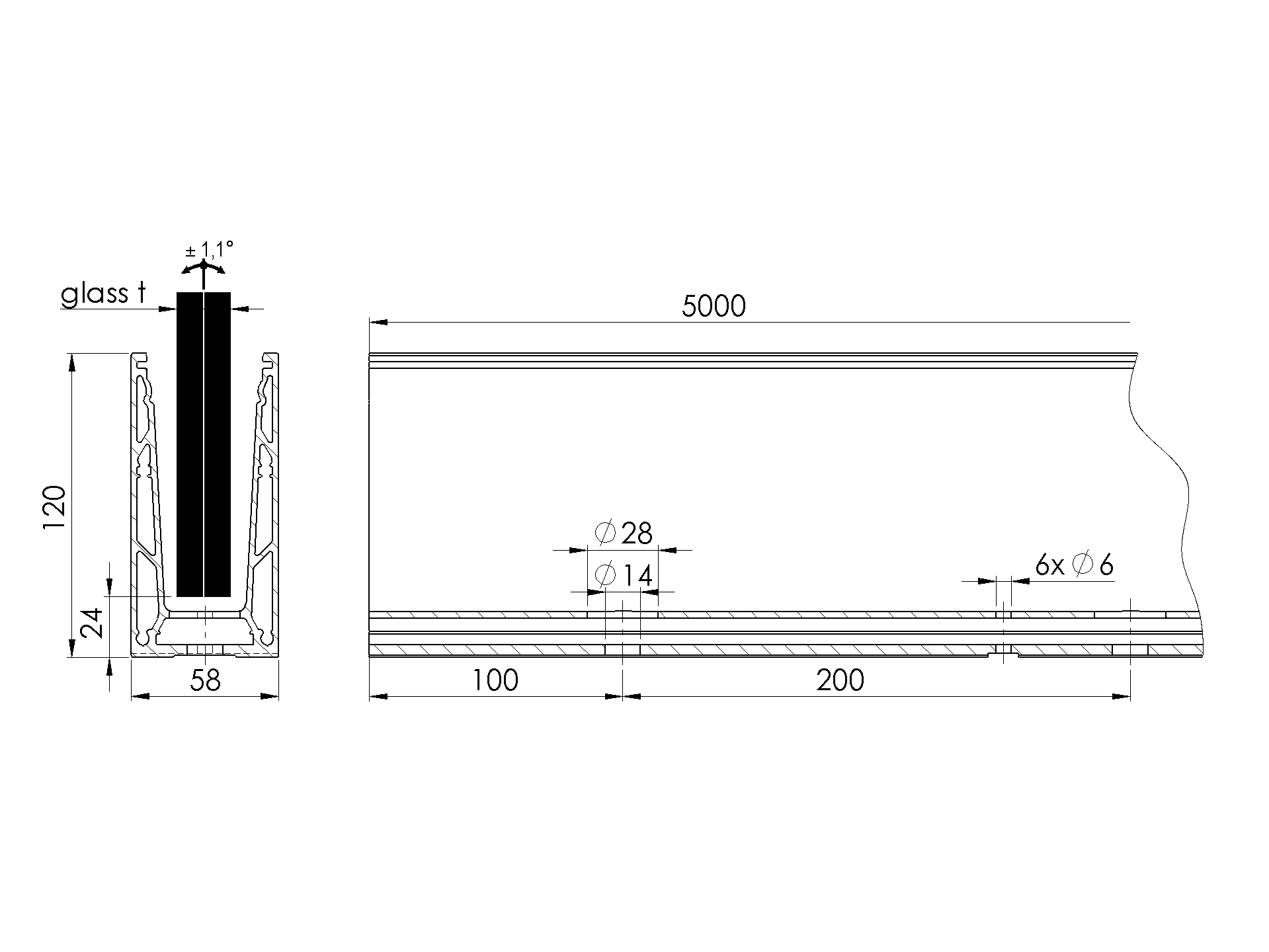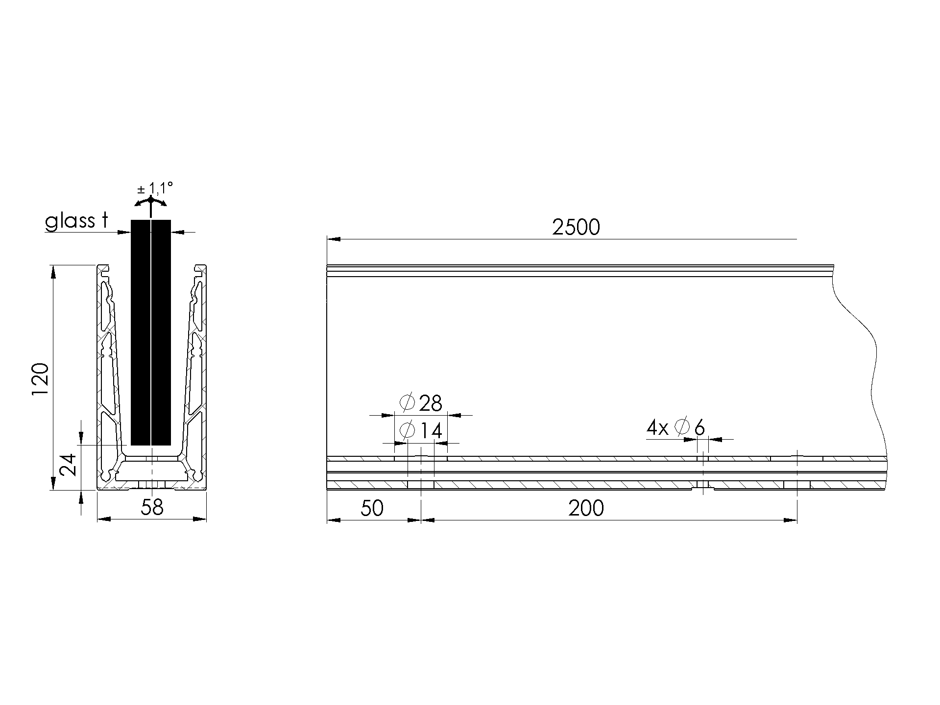 Al. anchoring profile ELOX 120/57mm for glass T=12 to 17.52mm, top floor anchoring, adjustable glass tilt. Supplied in lengths L2500mm (13 holes d14mm for anchoring). Supplied without seals. Surface finish ELOX - brushed.