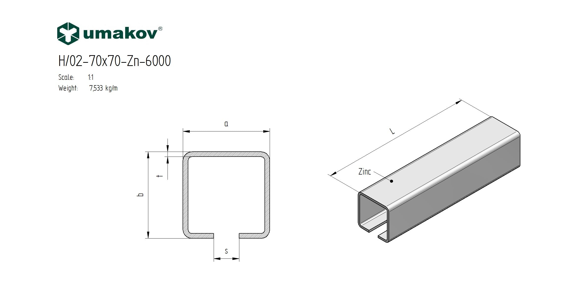 Base inférieure Zn, profil 70x70mm H/15P-70